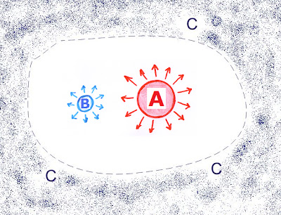 Let object A represent a warmer object radiating to an infinite heat sink C maintained at absolute zero. Object B is introduced into its field of radiation and so is warmed: